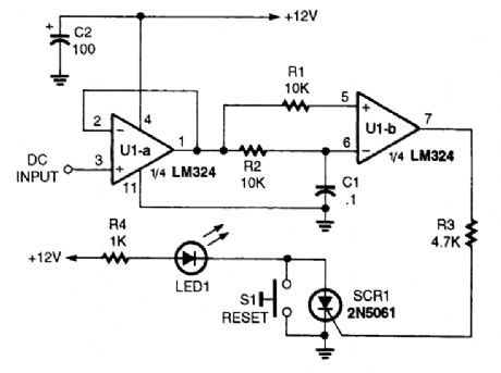 In the circuit, two op amps (half of an LM324 quad op amp) and an SCR are direct coupled in a dc-voltage monitoring circuit. Op-amp UI-a is configured as a voltage follower, which feeds the bridged in-puts of the second op amp, U1-b. A resistor/capacitor combination (R2/C1) connected to the negative input of U1-b forms an RC time-delay circuit. As long as there is no change in the dc-voltage level at either of UI-b's inputs, its output is near zero. If a voltage glitch occurs, the RC timing circuit will delay the voltage change at the op amp's inverting input, causing its output to go high, triggering SCR1 and causing LED1 to light. The circuit's sensitivity allows it to detect voltage changes in the millivolt range.Pressing S1 diverts the SCR's holding current to ground, causing it to turn off and reset the circuit.