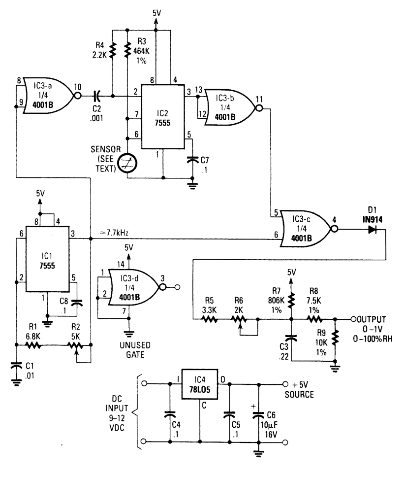 This circuit uses a Phillips capacitive humidity sensor that has a AC variation of 45 pF over 0 to 100 pf, RH. IC2 is an oscillator whose frequency is determined by the RH sensor, It is compared to fixed oscillator, and tie difference frequency is taken by IC3C and rectified, outputting a 0- to 1-V signal for RH between 0 and 100%.