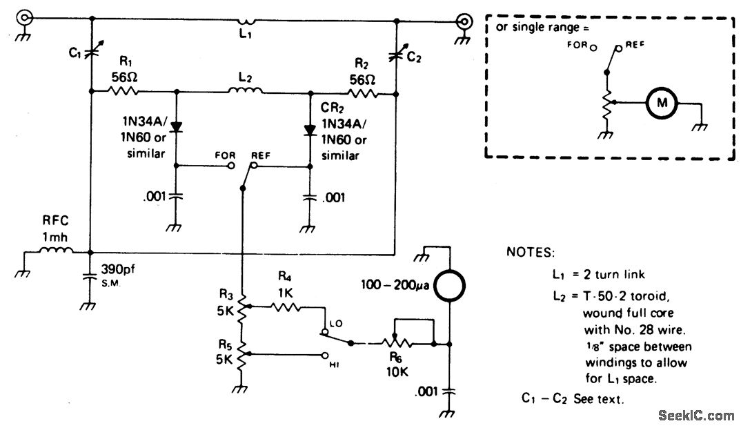 The circuit is not frequency sensitive. Its calibration will be accurate over a wide fre-quency spectrum, such as the entire amateur hf spectrum, if the values of L2, the voltage di-vider capacitors C1-2 and C3, and the resis-tances of RI-2 are chosen properly. R1-2 and CR1-2 should be matched for best results.Generally, R1-2 must be small compared to the reactance of L2 so as to avoid any significant effect on the L2 current which is induced by the transmission line current flowing through L1. The lower frequency limit of the bridge is set by the RI-R2/Ls ratio, and the cutoff is at the point where the value of RI-R2 becomes significant with reference to the reactance of L2 at that frequency point.