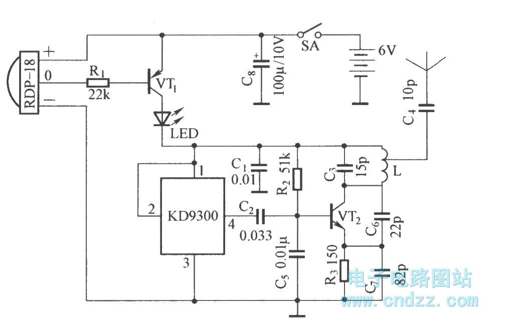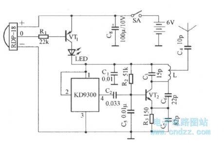 This circuit is composed of power switch circuit controlled by pyroelectric infrared detection module , analog music generating circuit and FM radio emission circuit component.