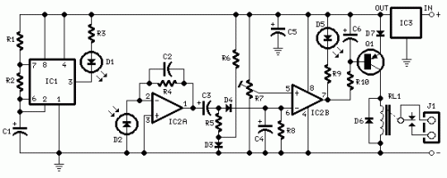 Parts:R1 10K 1/4W ResistorR2,R5,R6,R9 1K 1/4W ResistorsR3 33R 1/4W ResistorR4,R8 1M 1/4W ResistorsR7 10K Trimmer CermetR10 22K 1/4W ResistorC1,C4 1µF 63V Electrolytic or Polyester CapacitorsC2 47pF 63V Ceramic CapacitorC3,C5,C6 100µF 25V Electrolytic CapacitorsD1 Infra-red LEDD2 Infra-red Photo Diode (see Notes)D3,D4 1N4148 75V 150mA DiodeD5 LED (Any color and size)D6,D7 1N4002 100V 1A DiodesQ1 BC327 45V 800mA PNP TransistorIC1 555 Timer ICIC2 LM358 Low Power Dual Op-ampIC3 7812 12V 1A Positive voltage regulator ICRL1 Relay with SPDT 2A @ 220V switchCoil Voltage 12V. Coil resistance 200-300 OhmJ1 Two ways output socketDevice purpose:This circuit is useful in liquids level or proximity detection. It operates detecting the distance from the target by reflection of an infra-red beam. It can safely detect the level of a liquid in a tank without any contact with the liquid itself. The device's range can be set from a couple of cm. to about 50 cm. by means of a trimmer.Range can vary, depending on infra-red transmitting and receiving LEDs used and is mostly affected by the color of the reflecting surface. Black surfaces lower greatly the device's sensitivity.