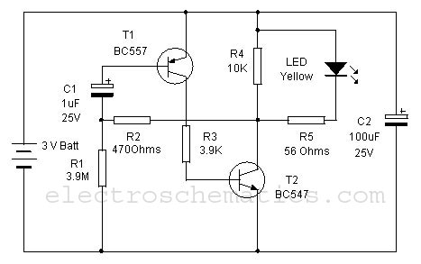 The circuit is a simple oscillator comprising two complementary transistors BC 547 and BC557. These NPN and PNP transistors are wired as a simple oscillator with components C1 and R1 so that the LED flashes based on the charging and discharging of C1. Current consumption of LED is very low so that a normal 3 volt lithium battery can power the circuit for long time. A miniature 12 volt battery used in Car remote can power the circuit more than 2 years continuously.