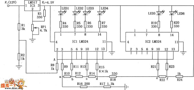 This circuit mainly consists of six light-emitting diodes, two integrated circuits and some resistors. It can display the voltage ofcar, motorcycle or electric bicycle batteriesaccording tothe quantityof light-emitting diode lights. Its usage is very convenient.