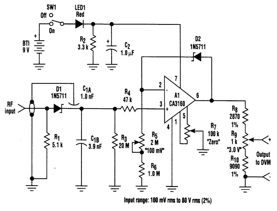 The circuit produces an extremely linear dc output for RF inputs between 80 mV rms and 4.0 mV rms. For inputs below 50 V rms, the dc output quickly drops to 0 V.