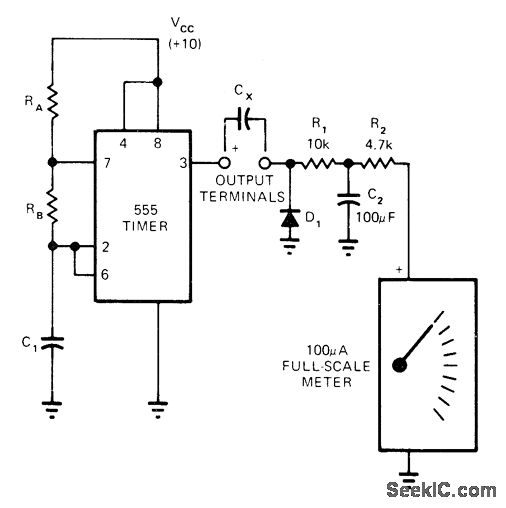 Wide frequency range and high output current of 555 timer contribute to linearity of operation as capacitance meter.Timer is connected as astable MVBR with frequency determined by values used for RA, RB, and C1. When timer output is high, unknown capacitance C1, is charged almost to VCC. When timer goes low, Cx discharges through D1. Use 100 kHz for 100-pF full-scale reading, 10kHz for 1 nF, 1 kHz for 10 nF, and down to 1 Hz for 10μF. Use regulated supply.-R. Horton, 555 Timer Makes Simple Capacitance Meter, EDN Magazine, Nov. 5, 1973, p 81.