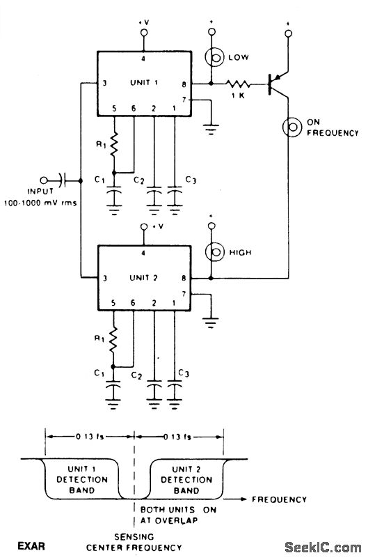 The circuit shows how two tone decoders set up with overlapping detection bands can be used for a go/no go frequency meter. Unit 1 is set 6% above the desired sensing frequency and Unit 2 is set 6% below the desired frequency.Now, if the incoming frequency is within 13% of the desired frequency, either Unit 1 or Unit 2 will give an output. If both units are on, it means that the incoming frequency is within 1% of the desired frequency. Three light bulbs and a transistor allow low cost read-out. The IC is an EXAR 567.