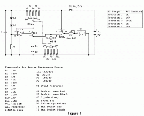 The CircuitMost linear scale resistance meters including the present design, work on the principle that if a resistance is fed from a constant current source the voltage developed across that resistance is proportional to its value. For example, if a 1K resistor is fed from a 1 mA current source from Ohm’s Law it can be calculated that 1 volt will be developed across the resistor (1000 Ohms divided by 0.001 amps = 1 volt). Using the same current and resistance values of 100 ohms and 10K gives voltages of 0.1volts (100 ohms / 0.001amps = 0.1volts) and 10 volts (10000 ohms / 0.001amps = 10 volts).Thus the voltage developed across the resistor is indeed proportional to its value, and a voltmeter used to measure this voltage can in fact be calibrated in resistance, and will have the desired forward reading linear scale. One slight complication is that the voltmeter must not take a significant current or this will alter the current fed to the test resistor and impair linearity. It is therefore necessary to use a high impedance voltmeter circuit.The full circuit diagram of the Linear Resistance Meter is given in Figure 1. The constant current generator is based on IC1a and Q1. R1, D1 and D2 form a simple form a simple voltage regulator circuit, which feeds a potential of just over 1.2 volts to the non-inverting input of IC1a. There is 100% negative feedback from the emitter of Q1 to the inverting input of IC1a so that Q1’s emitter is stabilised at the same potential as IC1a’s non-inverting input. In other words it is stabilised a little over 1.2 volts below the positive supply rail potential. S3a gives 5 switched emitter resistances for Q1, and therefore 5 switched emitter currents. S3b provides 5 reference resistors across T1 & T2 via S2 to set full-scale deflection on each range using VR1.As the emitter and collector currents of a high gain transistor such as a BC179 device used in the Q1 are virtually identical, this also gives 5 switched collector currents. By having 5 output currents, and the current reduced by a factor of 10 each time S3a is moved one step in a clockwise direction, the 5 required measuring ranges are obtained. R2 to R6 must be close tolerance types to ensure good accuracy on all ranges. The high impedance voltmeter section uses IC1b with 100% negative feedback from the output to the inverting input so that there is unity voltage gain from the non-inverting input to the output. The output of IC1b drives a simple voltmeter circuit using VR1 and M1, and the former is adjusted to give the correct full-scale resistance values.The CA3240E device used for IC1 is a dual op-amp having a MOS input stage and a class A output stage. These enable the device to operate with the inputs and outputs right down to the negative supply rail voltage. This is a very helpful feature in many circuits, including the present one as it enables a single supply rail to be used where a dual balanced supply would otherwise be needed. In many applications the negative supply is needed simply in order to permit the output of the op-amp to reach the 0volt rail. In applications of this type the CA3240E device normally enables the negative supply to be dispensed with.As the CA3240E has a MOS input stage for each section the input impedance is very high (about 1.5 million Megohms!) and obviously no significant input current flows into the device. This, together with the high quality of the constant current source, and the practically non-existent distortion through IC1b due to the high feedback level gives this circuit excellent linearity.With no resistor connected across T1 & T2 M1 will be taken beyond full-scale deflection and overloaded by about 100 or 200%. This is unlikely to damage the meter, but to be on the safe side a push-to-test on/off switch (S1) is used. Thus the power is only applied to the circuit when a test resistor is connected to the unit, and prolonged meter overloads are thus avoided.A small (PP3 size) 9 volt battery is a suitable power source for this project which has a current consumption of around 5mA and does not require a stabilised supply.