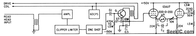 Magnetic strip recorded on tape is scanned transversely with ring-type play-back head, and periods between output pulses generated at crossover points are measured. C1 acquires positive charge for one direction of skew and negative charge for other. Output of detector of C1, which measures this charge, is fed to difference amplifier having microammeter connected between cathodes to read tracking error.-B. R. Gooch, Magnetic Strip Keeps Tape Running True,Electronics,36:2, p42-43.