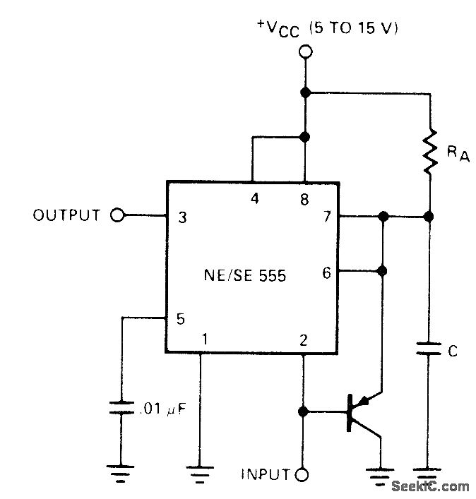 Timing cycle of 555 timer is continuously reset by input pulse train. Change in input frequency or missing pulse allows completion of timing cycle, producing change in output level. Component values should be chosen so time delay is slightly longer than normal time between pulses.- Signetics Analog Data Manual, Signetics, Sunnyvale, GA, 1977, p 723.