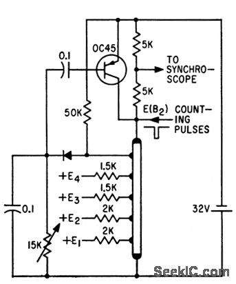 Experimental equivalent of cold-cathode counter tube, developed in Poland, cam serve also as staircase wave form generator. Although circuit shown, with five gm junctions on one side of n-type semi-conductor bur, gives only count of five before transistor restores initial state, decade counter would have ten junctions on bar.-A. Ambroziak, Semiconductor Analog of a Cold-Cathode Counter Tube, Electronics, 35:6, p 46-47.