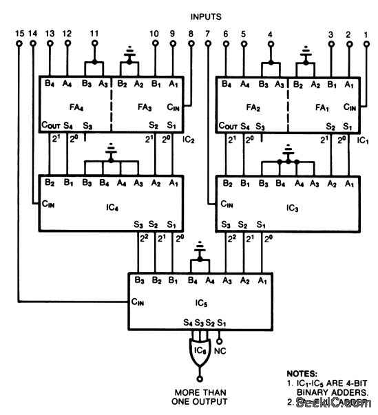 Each binary adder, IC1 and IC2, forms two full adders (FAs). Each FA monitors three input lines and generates a 2-bit output representing the number of inputs active. IC3 and IC4, by summing the outputs of two FAs plus an input line, individually measure how many in a group of seven inputs are active. Similarly, by monitoring the 3-bit outputs of IC3 and IC4 plus one input, IC5 measures how many in the group of 15 are active. The OR gate, IC6, simply indicates whether more than one input is active.