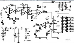Op amps IC1a and IC1b carry a pure sinusoidal signal that alternates symmetrically around a direct voltage of 3 V, whereas that of IC1c alternates around 0 V. This means that this op amp can handle an amplification of x 2.2 much better than the earlier two. The drop across C6 is used by the display driver, IC2, to represent the strength of the magnetic field. The driver has its own reference-voltage source. This 1.25 V source is also used to derive an auxiliary voltage for op amps IC1a and IC1b. The potential at node A is [ ( R14 + R15 ) / R15 ] x 1.25 = 3 V.