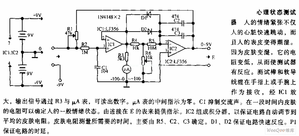 People's emotional stress not only makes the human heart beat fast, and people's skin become wet. Because the skin becomes wet, its resistance becomes low, so that the test device reacts. Test bars and soft wires are wrapped around the fingers or wrist as a receiver, the output signal is amplified by IC1 and read out by μA meter and R3. μA middle indicates 0, then C1 suppresses hum. During the period of time, the skin resistance can determine people's general emotional state, which is indicated by the table connected to the E. IC2 forms the integrator to ensure that the circuit automatically adjusts the average skin resistance.