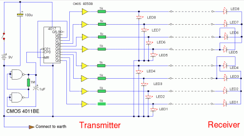 Circuit Description:The circuit comprises transmitter and receiver, the cable under test linking the two. The transmitter is nothing more than a LED chaser the 4011 IC is wired as astable and clocks a 4017 decade counter divider. The 4017 is arranged so that on the 9th pulse, the count is reset. Each LED will light sequentially from LED 1 to LED 8 then back to LED 1 etc. As the 4017 has limited driving capabilities, then each output is buffered by a 4050. This provides sufficient current boost for long cables and the transmitter and receiver LED's. The receiver is simply 8 LED's with a common wire...read on.