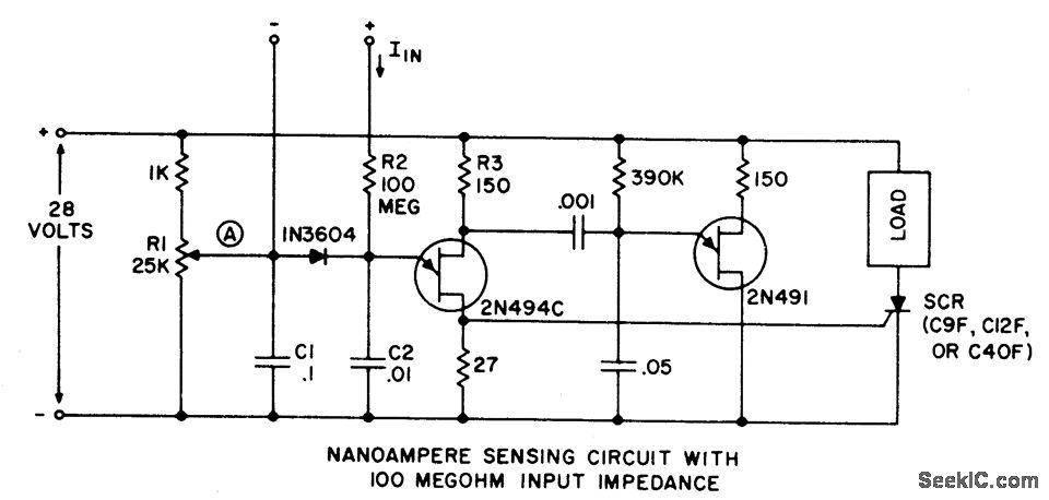 The circuit may be used as a sensitive current detector or as a voltage detector having high input impedance. RI is set so that the voltage at point (A) is Vz to 3A volts below the level that fires the 2N494C. A small input cur-rent (Iin) of only 40 nanoamperes will charge C2 and raise the voltage at the emitter to the firing level. When the 2N494C fires, both capacitors, C1 and C2, are discharged through the 27 ohm resistor, which generates a positive pulse with sufficient amplitude to trigger a con-trolled rectifier (SCR), or other pulse sensitive circuitry.