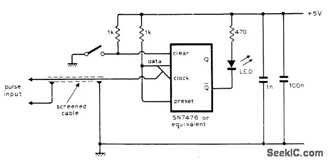 Used to provide visual indication of presence of a nonrepetitive digital pulse having microsecond or nanosecond width. Bistable IC transfers pulse information from its data input to the Q output on positive-going edge of clock pulse, to energize LED indicator.-P. V. Prior, Digital Pulse Detector, Wireless World, March 1976, p 90.