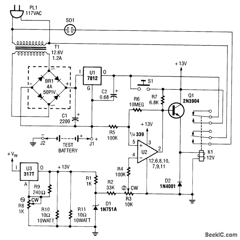 This Nicad battery tester discharges the test battery at a rate of 500 mA.When the endpoint of 1 V(determined by setting of R3) is resolved,pin 2 of U2 becomes low, deactivating Q1 and disconnecting thetest battery from the circuit, Power for U3 comes from the 12-V regulator h series with the battery beingtested, A clock or timer can be plugged into S1 to indicate the time it takes to discharge the battery undertest.