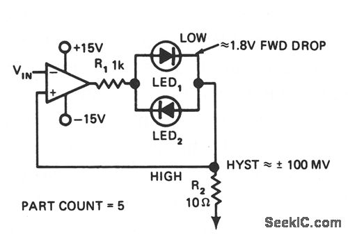 In this indicating comparator circuit, R2 setsthe hysteresis,If the 741 saturates at ±12 V. the current in R1 will be approximately±10 mA if 0.1 V hysteresis iS desired,Then 0.1 V/10 mA=10Ω=R2.