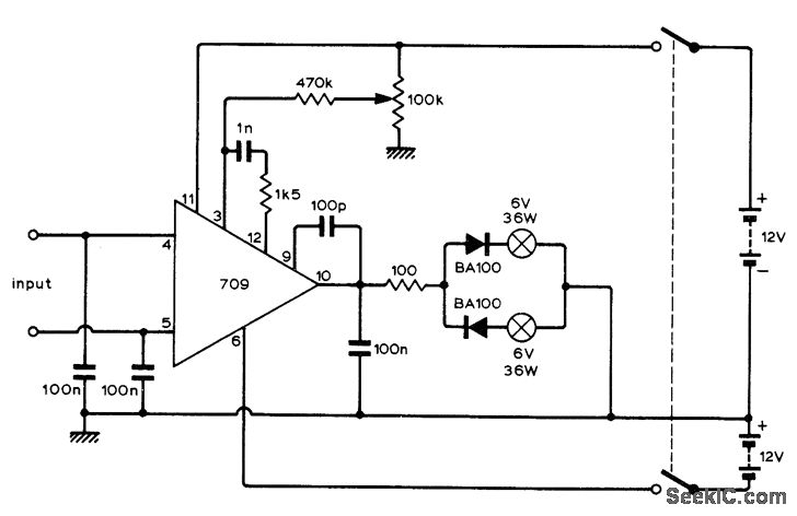 Opamp is driven open-loop so change of only 1 mV in input voltage makes output switch polarity. This is indicated by one of lamps. Both lamps go out to indicate null. If LEDs are used in place of lamps, diodes are not needed; adjust series resistance as required for full brilliance of LEDs.-B. P. Cowan, Miniature Null Indicator, Wireless World, June 1973, p 284.