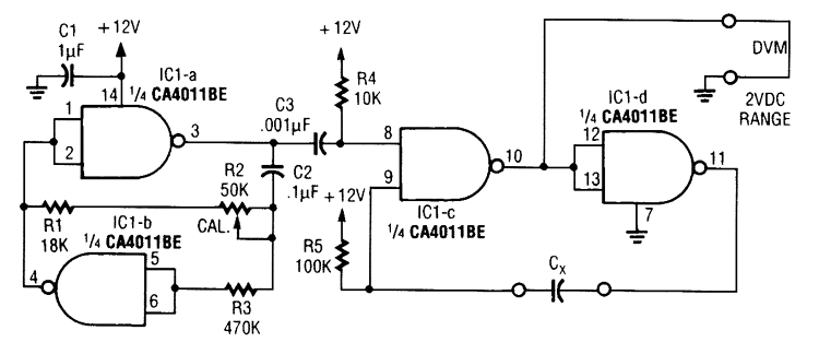 This circuit can be used to match capacitors, etc. The dc output voltage is related to the capacitance values of Cx The circuit values shown are for capacitors in the 0.01-μF order of magnitude, but they can be changed for lower or higher values.