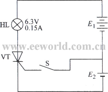 It takes four 1.5V batteries connected in series, then switch S is connected, E1 cathode is connected to anode of ordinary thyristor VS by lamp HL. E2 negative pole is connected to VT cathode. Close the S, HL is not extinguished. Because the lamp resistance is small, the current flowing through VT is sufficient to maintain triggered conduction current. Only disconnecting the anode or cathode connection of the thyristor, VT will shutdown, HL is extinguished.
