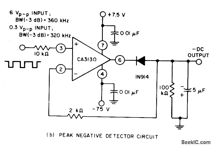Circuits are easily implemented using the CA3130 BiMOS op amp. For large-signal inputs the bandwidth of the peak-negative circuit is less than that of the peak-positive circuit. The second stage of the CA3130 limits bandwidth in this case.