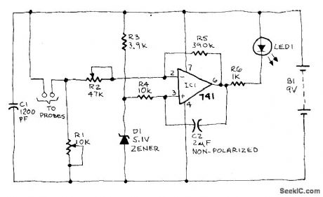 When the soil is moist, the LED glows. If the moisture falls below a certain predetermined level, the LED begins to flash. If there is still less moisture, the LED tums off. To calibrate, connect the battery and insert the probe into a container of dry soil. Set R1 to its maximum value then reduce that resistance until the LED begins to flash. The range over which the LED flashes before going out is adjusted using R2.