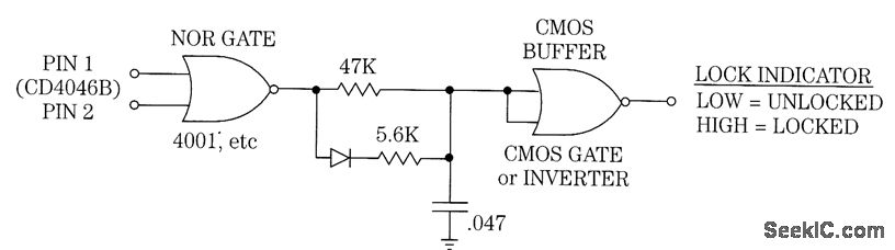 When the loop is locked, the waveforms at pins 1 and 2 of CD4046B are almost identical, differing only in polarity. This holds the output of the NOR gate low. When the loop is not locked, the output of the NOR gate is a series of pulses. This charges the 0.047-μF capacitor, and causes a low output from the CMOS buffer.