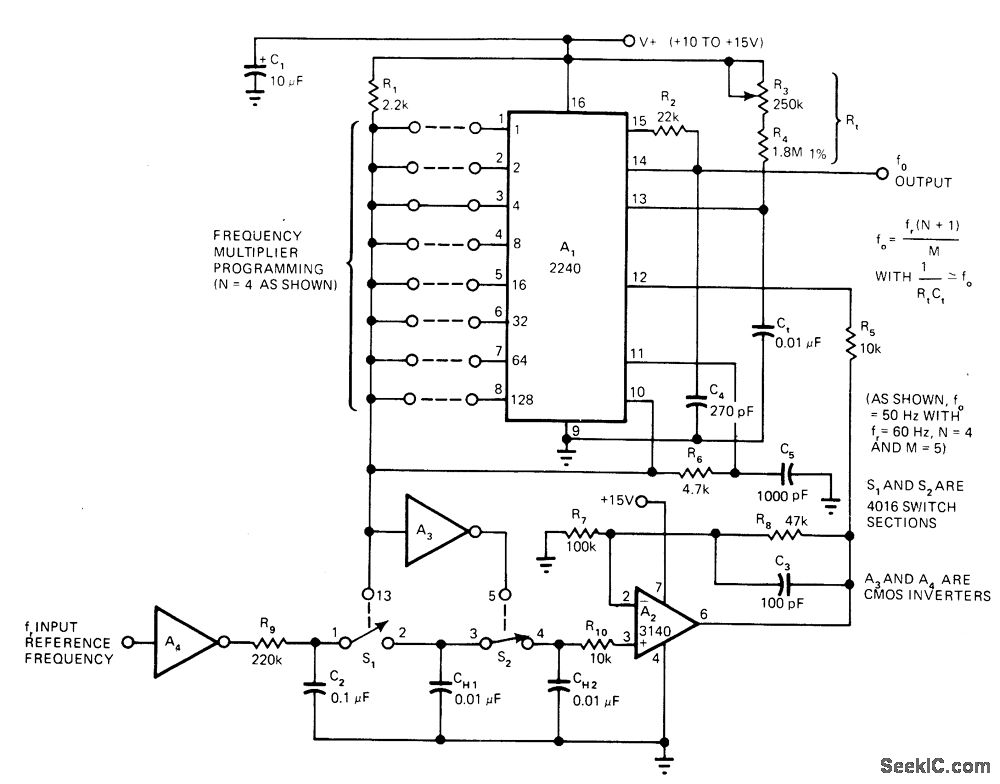 Uses 2240 programmable timer/counter as combination voltage-con-trolled oscillator and frequency divider, with CMOS analog switches serving as sample-and-hold phase detectors. Incoming reference frequency is amplified and limited by CMOS inverter, then integrated into reference triangle waveform by R9-C2. Triangle is sampled by S1 and S2 whieh with CH1 and CH2 form cascaded sample-and-hold network that holds only last instantaneous voltage on CH1 as error voltage. This error is amplified by FET-input 3140 opamp A2 for driving pin 12 of 2240 timer as correction voltage, to establish lock. Reference and output frequencies need not have direct harmonic