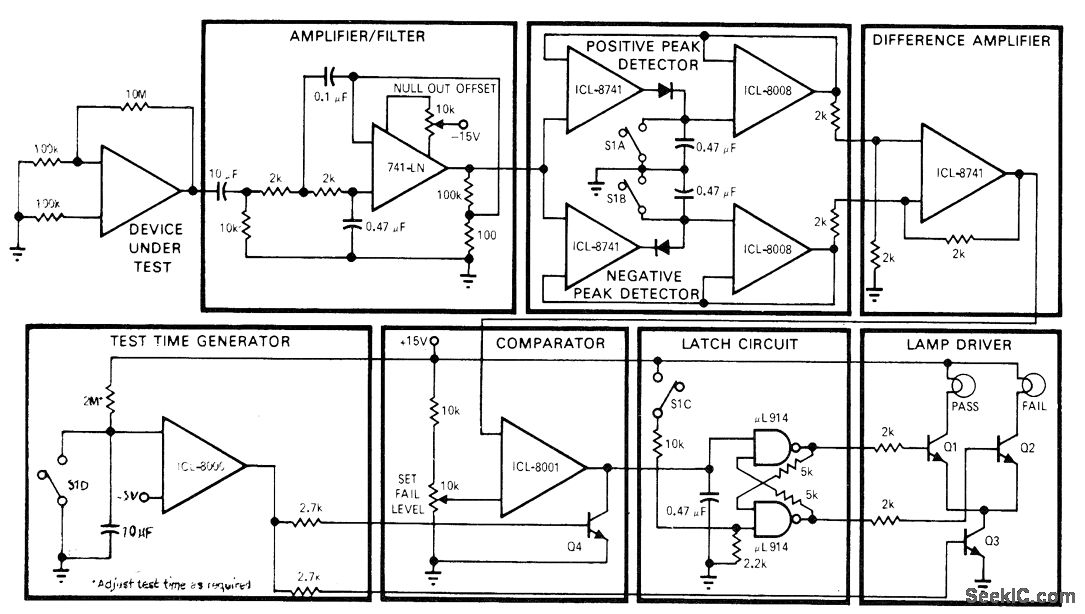 Developed at Intersil to test opamps for erratic low-frequency jumps between two or more stable states. After start-up switch S is closed, pass/fail lamps are inhibited by Q3. At end of preselected test time (typically 5 s), one of lamps will come on. If output from difference amplifier exceeds preset fail level at inverting input of comparator during test period, fail lamp is turned on by Q2. Q4 prevents triggering of latch by spurious signals after end of test time.-T. P. Rigoli, IC Op Amps, EDNMagazine, May 1, 1971, p 23-33.