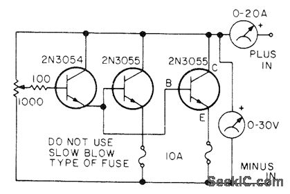 Serves as high-current solid-state-resistor load for testing power supplies before use, to determine voltage and current under load. Darlington configuration of transistors reduces power-dissipating requirements of pot. Use large heatsink for 2N3055s because they must dissipate almost 200 W when powersupply is delivering 15A at 15V.-E. Fruitman, The Smoke Tester, 73 Magazine, Nov, 1976, p 159.