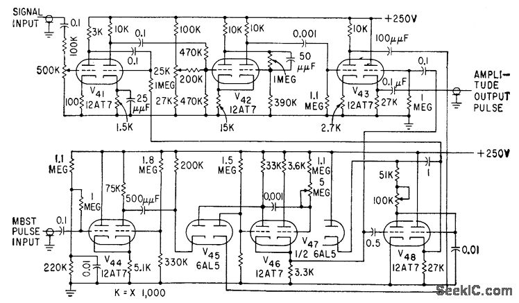 Produces pulse whose width is linearly related to se looted portion of input signal. V42 is Schmitt trigger. V46 is flip-flop controlled by output from mognetron-beam switching tube (MBST) for selecting desired sample of signal. Output pulse width is sampled and measured by counter.-J. F. Lyons, Jr., Analyzing Multipath Delay in Communications Studies, Electronics, 32:36, p 52-55.