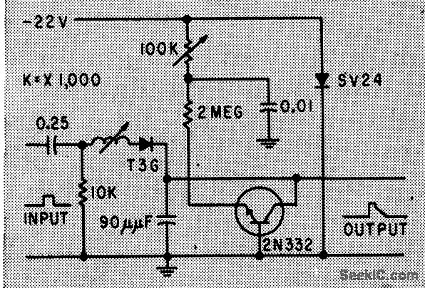 Converts 0 to 2-V pulse to gate for pulse height to pulse width conversion. Gate width, directly proportional to data pulse amplitude, is applied to dock circuits.-W. W. Grannemann et al., Pulse-Height-to-Digital Signal Converter, Electronics, 33:2, p 58-60.