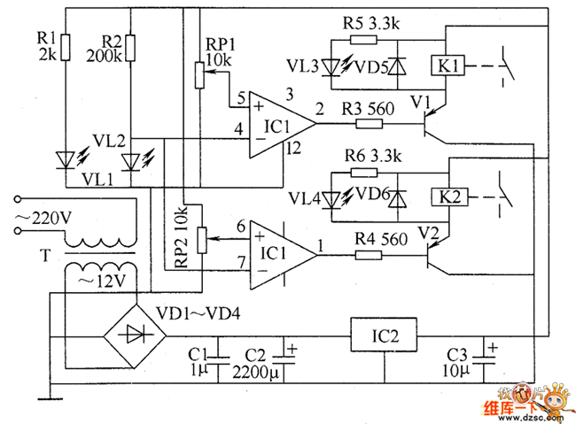 The paper thickness detector circuit is composed of the power supply circuit, infrared detection circuit and control implementation circuit, and it is shown as the chart. Power supply circuit consists of the power transformer T, rectifier diodes VD1 ~ VD4, filter capacitors C1 ~ C3 and three-terminal regulator IC2 and so on. Infrared detection circuit consists of the infrared emitting diode VL1, infrared receiver diode VL2, operational amplifier integrated circuit IC1 and the peripheral components. Control implementation circuit consists of the transistors V1, V2 and relays K1, K2 and so on. R1 ~ R6 use the 1/4W carbon film resistors or metal film resistors.