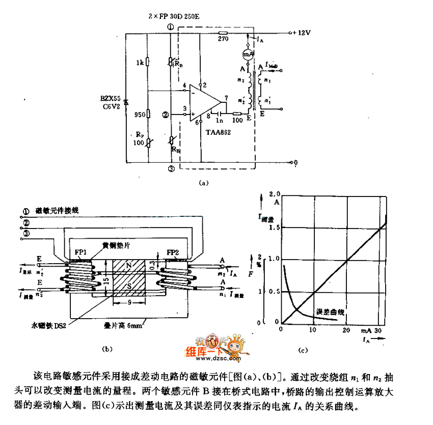 This circuit sensitive component is connected into the magnetic susceptibility component of the differential circuit. By changing the taps of winding n1 and winding n2, you can change the measuring range of the measuring current. The two sensitive components B are connected in the bridge type circuit, the output of the bridge type circuit controls the differential input port of the operational amplifier. Figure (c) shows the relation curve between the measuring current and the measurement error meter indicating current IA.