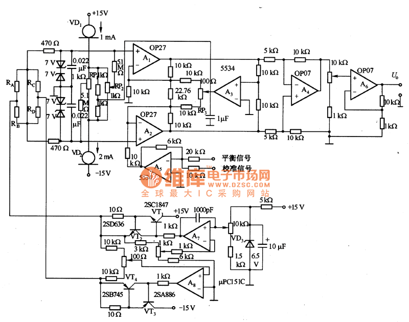 The figure 1 is a pressure measurement circuit which is composed of OP27. In the circuit, the instrumentation amplifier is composed of A1、A2、A4, the amplitude limiter circuit is composed of input partial four 7V regulator tubes. PR1 and PR2 is used to adjust the input bias current of A1, A2 to 200nA. In order to improve the common-mode rejection ratio, it should be connected to circuit, RP3 is used to adjust the common-mode rejection ratio. VT1-VT4 and A7, A8 provide pressure sensor with work power supply.