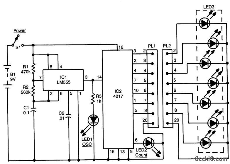 This circuit can be used to check up to an eight-conductor cable. IC1, a 555 timer, drives decade counter 1C2, a 4017. Each LED should light in sequence. The cable to be tested is connected between PL1 and PL2. If the cable is miswired, the LEDs will light out of sequence. If it is shorted or open, some LEDs will not light.