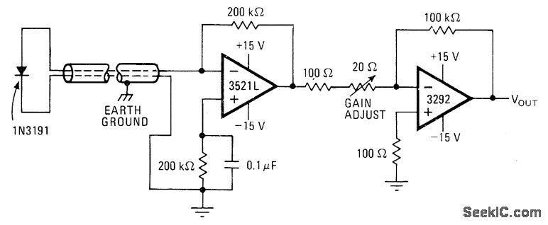 1N3191 commercial diode serves as sensor in high-accuracy dosagerate meter for gamma rays and high-energy Xrays used in radiotherapy. Diode is small enough for accurate mapping of radiation field.Output voltage varies linearly from 0.1 V to 10 V as dose rate increases from 10 to 1000 rads per minute. Low-drfft FET-input 3521L opamp amplifies detector current to usable level for 3292 chopper-stabilized opamp that provides additional gain while minimizing temperature errors.-P. Prazak and W. B. Scott, Radiation Monitor Has Linear Output, Electronics, March 20, 1975, p 117; reprinted in Circuits for Electronics Engineers, Electronics, 1977, p 106.