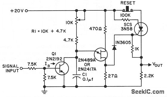 Used to Provide indiration of momentary dropout of d-c,a-c,or pulse input signal.lime between disappear of signal and indication of fault is adiustable. Outpul signal remains until scs is tumed off by momentarily opening reset switch.- Transistor Manual, Seventh Edition, Genercd Electric Co., 1964, p 336.
