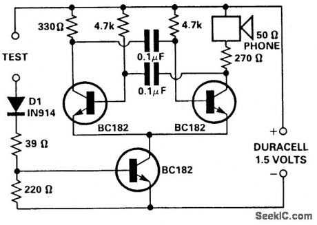 Circuit NotesThis tester is for tracing wiring on Printed Circuit Boards. Resistors below 50 ohms act as a short circuit; above 100 ohms as an open circuit. The circuit is a simple multivibrator switched on by transistor T3. The components in the base of T3 are D1, R1, R2, and the test resistance. With a 1.5 volt supply, there is insufftcient voltage to turn on a semiconductor connected to the test terminals.