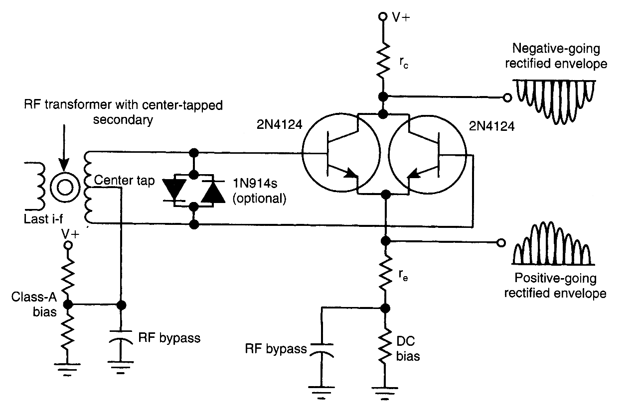 Simple, yet sensitive, this amplifying full-wave detector circuit has an almost zero rectification threshold. It presents a highly linear RF load to the final IF stage. The gain for the collector output is given (approximately) by rc/re, The emitter output gain is slightly less than unity.