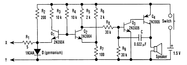 Transistors Q1 and Q2, together with resistors RI through R7, make up the input balancing stage, which senses the resistance between points X and Y. The input stage is essentially a bridge, consisting of RI, R2, R6, R7, and the resistance between points X and Y.Transistors Q3 and Q4 and their associated passive components form a buzzer, which sounds when the tester detects a short. The buzzer is controlled by the output from Q2. When the input re-sistance is high (more than about 10Ω), Q2 turns on, so its collector potential is close to ground, and the buzzer remains off. When the input resistance is sufficiently low, Q2 turns off, and the buzzer sounds. The frequency of the sound, which is about 1000 Hz, can be adjusted by varying the value of capacitor (C).