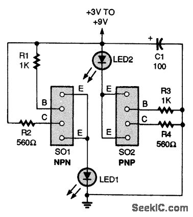 When a T092-type transistor is placed in the correct socket, if the transistor is good, the circuit turns on, according to the kind of transistor being tested. For example, if a good NPN unit is tested, LED1 turns on. Note that two emitter positions are in each socket. Transistors have different pin configurations. Some are BBC, and some are ECB. If you don't know the configuration, you can test all the possible pin positions until an LED turns on. You'll need to know if the transistor is an NPN or a PNP type, however. The supply voltage can be 3 to 9 V. There is no power switch because, without a socketed transistor, capacitor C1 is the only load on the battery. For the sockets, use an eight-pin, mini-DIP socket.