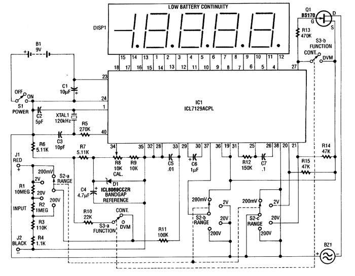 This 4 1/2-digit DVM circuit is built around a Maxim ICL7129ACPL A/D converter and LCD driver. An ICL8069 CCZR 1.2-V band-gap reference diode is used for a voltage reference. S2a-b-c select one of four ranges up to 200 V (maximum). The meter also has a piezoelectric buzzer for continuity testing. S3 selects either DVM or continuity. Crystal 1 can be changed to 100 kHz if maximum rejection of 50 Hz is desired. The crystal normally provides 120 kHz for best 60-Hz rejection. This is caused by the dual-slope conversion technique used in IC1.