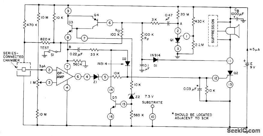 Battery-operated ionization-type srnoke detector uses RCA CA3130 opamp as interface for ionization chamber that provides picoampere currents. With opamp in pulsed mode (on for 20 ms of 20-s period), IC draws only 0.6 μA average instead of 600 μA.Other active components and zener, all on RCA CA3097 array, provide Low-battery monltor and horn-driver functions. When chamber detects smoke, combination of RF and D1 provides sufficient base current to keep Q3 and Q4 on.Opamp is then powered continuously, and steering diode Z1 supplies continuous current to gate of Q2 for energizing hom. Battery drain is only 5 mA in monitoring mode.-G. J. Granieri, Bipolar-MOS and Bipolar IC's Buildlng Blocks for Smoke-Detector Circuits, IEEE Transactions on Consumer Electronics, Nov. 1977, p 522-527.