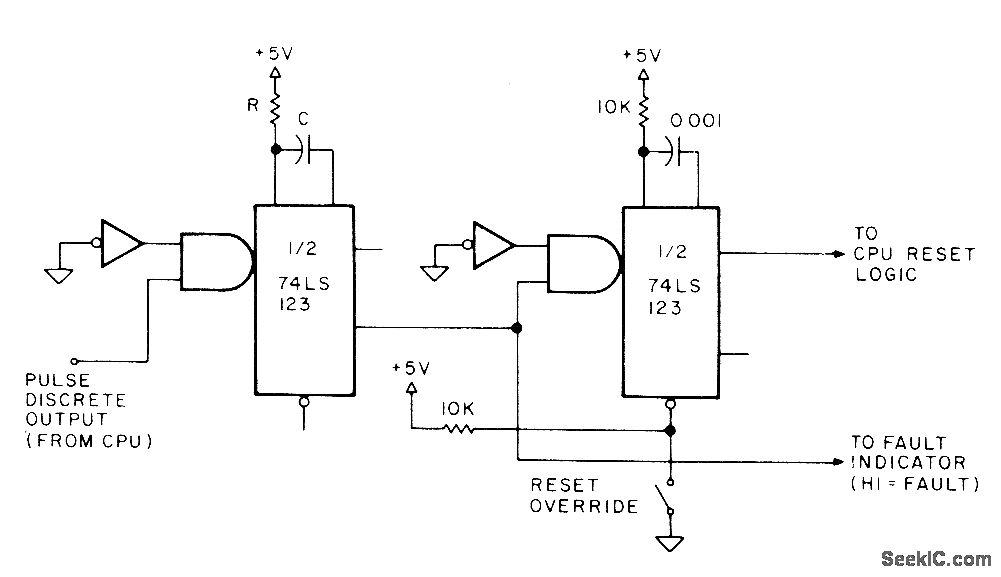 Detects large percent-age of random faults, such as overflow conditions. Based on fact that part of program passes through reentry on predictable repeat basis. For each reentry, pulse is fed from CPU to input of ,, 74LS123 retriggerable mono MVBR. On each pass through program, programmer sets and then resets MVBR. Period of mono is made longer than longest normal time between programmed pulse outputs, to prevent false alarms. Any system fault that makes program repeat instructions endlessly or lose control will give false indication.-D. Brickner, Get a Watch-dog to Monitor Those Real-Time Operations, Kilobaud, April 1978, p 118-119.