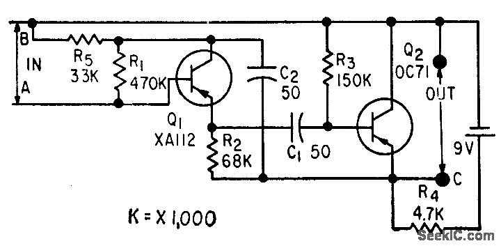 Two-transistor circuit takes high-impedance microphone feeding compound grounded-collector stage in which collector, emitter load, and biased resistor of Q1 are bootstrapped.-W. V Richings and B. J. White, Transistorized Sound Level Meter, Electronic, 33:25, p 64-66.