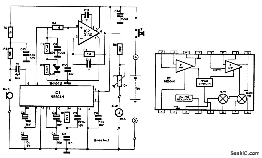 The signal source is assumed to be an electret microphone that converts ambient noise into an electri-cal signal. Because this type of microphone normally contains a buffer stage, R7, R8, and C13 have been included to provide the supply voltage for this stage.