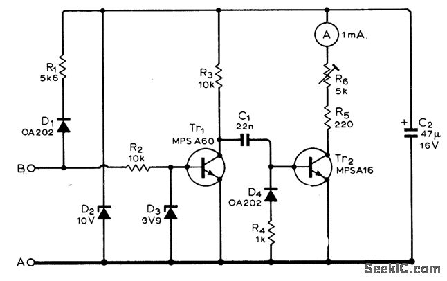 Developed for use with 10-60 VAC generator driven by Iawn mower engine, as guide for adjusting speed manually to give correct power-line frequency. Output of altemator, connected to A and B,is converted to regulated 10VDC by R1, D1, D2, and C2. Same input voltage is squared by Tr1 and fed to Tr 2through differentiating circuit. Current pulses developed in collector circuit of Tr2 have constant width and varying repetition rate depending on input frequency. Inertia of meter movement provides integration required to give steady reading that changes only with input frequency. Meter scale is calibrated from 0 to 100 Hz,with R6 adjusted to give correct reading when 10-60 VAC Iine voltage is applied to input. Power transformer must be used to boost output of alternator to correct AC Iine voltage.-J. M. Caunter,Low-Cost Emergency Power Generator, Wlireless World, Feb. 1975,p 75-77.