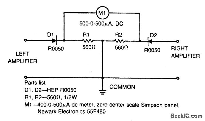 The meter will show volume and tone control balance between left and right stereo amplifiers. For maximum convenience the meter is a zero-center type. Resistors are five percent or better and the diodes a matched pair. Optimum stereo level and phase balance occurs for matched speakers when the meter indicates zero. If the meter indicates either side of zero, the levels are not matched or the wires are incorrectly phased. Check phasing by making certain the meter leads are connected to the amplifier hot terminals and the common leads go to ground.